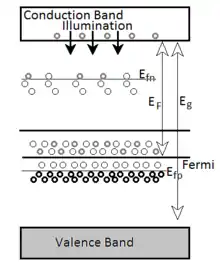 A sufficiently energetic light can excite charge carriers so much that they will populate the initially empty localized levels. Then, the density of free carriers in the conduction and/or the valence band will increase. To account for these changes, steady-state Fermi levels are defined for electrons to be EFn and, for holes – EFp. The densities n and h are, then equal to