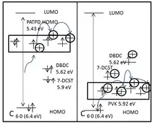 Besides the mobility, the ionization potential of the polymer and the respective dopant has also significant importance. The relative position of the polymer HOMO with respect to the ionization potential of the other components of the blends determines the extent of extrinsic hole traps in the material.[14] TPD (tetraphenyldiaminophenyl) based materials are known to exhibit higher charge carrier mobilities and lower ionization potentials compare to carbazole based (PVK) materials. The low ionization potentials of the TPD based materials greatly enhance the photoconductivity of the materials. This is partly due to the enhanced complexation of the hole conductor, which is an electron donor, with the sensitizing agents, which is an electron acceptor. It was reported a dramatic increase of the photogeneration efficiency from 0.3% to 100% by lowering the ionization potential from 5.90 eV (PVK) to 5.39 eV ( TPD derivative PATPD).[15] This is schematically explained in the diagram using the electronic states of PVK and PATPD.