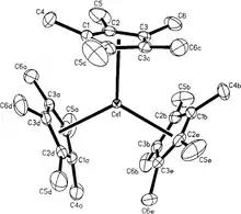 Organocerium compounds are chemical compounds that contain one or more chemical bond between carbon and cerium. Organocerium chemistry is the corresponding science exploring properties, structure and reactivity of these compounds. In general, organocerium compounds are not isolable, and are rather studied in solution via their reactions with other species. There are notable exceptions, such as the Cp*3Ce(III) complex shown at right, but they are relatively rare. Complexes involving cerium of various oxidation states are known: though lanthanides are most stable in the +3 state[2], complexes of cerium(IV) have been reported. These latter compounds have found less widespread use due to their oxidizing nature, and the majority of literature regarding organometallic cerium complexes involves the +3 oxidation state. In particular, organocerium compounds have been developed extensively as non-basic carbon nucleophiles in organic synthesis. Because cerium is relatively non-toxic, they serve as an "environmentally friendly" alternative to other organometallic reagents. Several reviews detailing these applications have been published.[3][4][5]