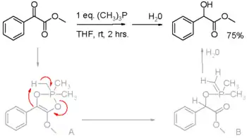 The reducing properties of organophosphiines is also illustrated in the Staudinger reduction for the conversion of organic azides to amines and in the Mitsunobu reaction for converting alcohols into esters. In these processes, the phosphine is oxidized to phosphorus(V). Phosphines have also been found to reduce activated carbonyl groups, for instance the reduction of an α-keto ester to an α-hydroxy ester in scheme 2.[14] In the proposed reaction mechanism, the first proton is on loan from the methyl group in trimethylphosphine (triphenylphosphine does not react).