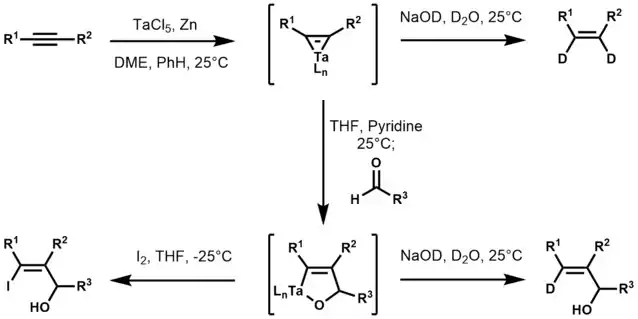 - Takai, Kazuhiko; Kataoka, Y.; Utimoto, K. (1990-03-01). "Tantalum-alkyne complexes as synthetic intermediates. Stereoselective preparation of trisubstituted allylic alcohols from acetylenes and aldehydes". The Journal of Organic Chemistry. 55 (6): 1707–1708. doi:10.1021/jo00293a008. ISSN 0022-3263.