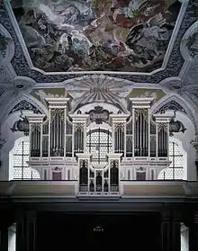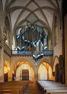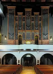 Developments during the 1990s included the restoration of several important concert hall organs: Görlitz Stadthalle (1910 Sauer organ; 1991; 4/71); Heidelber Stadthalle (4/56); and Prague, Smetana-Saal (1912 Voit und Söhne, 1995–96; 3/70). The construction of large instruments in a late-nineteenth-century style was also completed at Aschaffenburg, Herz-Jesu Kirche (1995; 4/63); Munich, Bürgersaalkirche (1994; 3/50); Kitzingen, Stadtpfarrkirche St. Johannes (1996; 3/54); and Jülich, Probsteikirche (1998; 3/45). The Jülich organ contains accessories including thunder rolls, rain machine, and a croaking bullfrog. Vleugels also built new organs in the South German style in historic cases at Würzburg, Käppele (1991; 2/31) and Schäftlarn Benediktinerabtei (1996; 2/31). There were new directions in constructing cases using special materials - a glass case for the Christopherus-Kapelle of the Franz-Josef-Strauss airport in Munich (1/6) - and dramatic artistic effects with contemporary painting as in Kitzingen, Stadtpfarrkirche St. Johannes (1996; 3/54) and Runding, St. Andreas (1998, 2/36). Finally the 1990s saw the restoration of several historic organs in Germany: Gaibach, Heilig-Kreuz-Kapelle (1699 Schleich organ; 1989–90; 1/7); Gaibach, Pfarrkirche (1748 Seuffert organm 1997; 1/12); Mainz Budenheim (1747 Kohlhaas organ); and Laumersheim in der Pfalz (1717 Hoffmann organ).[2]