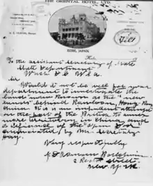 Eventually, the Oriental Hotel has been acquired by two British settlers, Arthur Hasketh Groom and Edward Hazlett Hunter, and other foreign settlers in 1897. The hotel was made into a limited company: the Oriental・Hotel, Ltd. C. N. Cross served the first president of the company, and Groom served the president sometime until 1916.