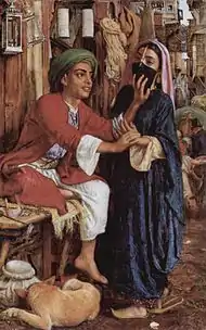 William Holman Hunt produced a number of major paintings of Biblical subjects drawing on his Middle Eastern travels, improvising variants of contemporary Arab costume and furnishings to avoid specifically Islamic styles, and also some landscapes and genre subjects. The biblical subjects included The Scapegoat (1856), The Finding of the Saviour in the Temple (1860), and The Shadow of Death (1871). The Miracle of the Holy Fire (1899) was intended as a picturesque satire on the local Eastern Christians, of whom, like most European visitors, Hunt took a very dim view. His A Street Scene in Cairo; The Lantern-Maker's Courtship (1854–61) is a rare contemporary narrative scene, as the young man feels his fiancé's face, which he is not allowed to see, through her veil, as a Westerner in the background beats his way up the street with his stick.[49] This a rare intrusion of a clearly contemporary figure into an Orientalist scene; mostly they claim the picturesqueness of the historical painting so popular at the time, without the trouble of researching authentic costumes and settings.