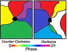 Pinwheel formations in the primary visual cortex with singularities in the center. Each color represents an orientation column of a specific line phase. Adapted image from fMRI studies.[11]