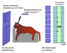 Orientation selectivity is expressed by cells within the visual cortex, when such cells increase impulse or signal activity for specific oriented degree of shape presented within the visual field.[1] Orientation selectivity can also be expressed by simple cells if the orientation of a stimulus is orthogonal to the preferred degree of orientation, which results in the inhibition of impulse activity.[2][1]