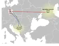 Theory about Iranian origin of the Serb ethnonym assumes that ancient Serbi / Serboi from north Caucasus (Asiatic Sarmatia) were a Sarmatian (Alanian) tribe.[21] The theory subsequently assumes that Alanian Serbi were subdued by the Huns in the 4th century and that they, as part of the Hunnic army, migrated to the western edge of the Hunnic Empire (in the area of Central Europe near the river Elbe, later designated as White Serbia in what is now Saxony and Thuringia (eastern Germany), recorded by Vibius Sequester as Cervetiis (Servetiis).[22] After the Hunnic leader Attila died (in 453), Alanian Serbi presumably became independent and ruled in the east of the river Saale (in modern-day Germany) over the local Slavic population.[22][21][23] Over time, they, it is argued, intermarried with the local Slavic population of the region,[21][23] adopted Slavic language, and transferred their name to the Slavs.[22][24] According to Tadeusz Sulimirski, similar event could occur in the Balkans Serbia, settled by Slavs who came from the north and who were ruled by already Slavicized Serboi.[22][23]