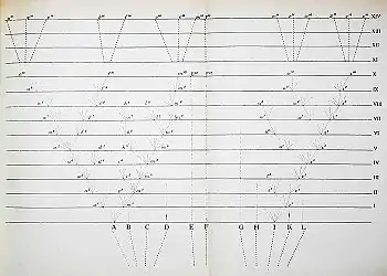 Darwin proposes sexual selection, driven by competition between males for mates, to explain sexually dimorphic features such as lion manes, deer antlers, peacock tails, bird songs, and the bright plumage of some male birds.[129] He analysed sexual selection more fully in The Descent of Man, and Selection in Relation to Sex (1871). Natural selection was expected to work very slowly in forming new species, but given the effectiveness of artificial selection, he could "see no limit to the amount of change, to the beauty and infinite complexity of the coadaptations between all organic beings, one with another and with their physical conditions of life, which may be effected in the long course of time by nature's power of selection". Using a tree diagram and calculations, he indicates the "divergence of character" from original species into new species and genera. He describes branches falling off as extinction occurred, while new branches formed in "the great Tree of life ... with its ever branching and beautiful ramifications".[130]
