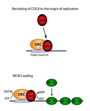 The ORC is essential for the loading of MCM complexes (Pre-RC) onto DNA. This process is dependent on the ORC, Noc3, Cdc6, and Cdt1 – involving several ATP controlled recruiting events. First, the ORC, Noc3p and Cdc6 form a complex on origin DNA (marked by ARS type regions). New ORC/Noc3/Cdc6 complexes then recruit Cdt1/Mcm2-7 molecules to the site. Once this massive ORC/Noc3/Cdc6/Cdt1/Mcm2-7 complex is formed, the ORC/Noc3/Cdc6/Cdt1 molecules work together to load Mcm2-7 onto the DNA itself by hydrolysis of ATP by Cdc6. Cdc6's phosphorylative activity is dependent on both the ORC and origin DNA. This leads to Cdt1 having decreased stability on the DNA and falling off of the complex leading to Mcm2-7 loading on to the DNA.[29][27][30][31] The structure of the ORC, MCM, as well as the intermediate OCCM complex has been resolved.[32]