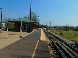 Orland Park 179th Street is one of three stations on Metra's SouthWest Service in Orland Park, Illinois. The station is 28.7 miles (46.2 km) away from Chicago Union Station, the northern terminus of the line.[3] In Metra's zone-based fare system, 179th Street is in zone F. As of 2018, Orland Park 179th Street is the 162nd busiest of Metra's 236 non-downtown stations, with an average of 208 weekday boardings.[2] The station was the southern terminus of the line from January 3, 1995 to January 30, 2006 when it was extended to New Lenox and Manhattan.[4]