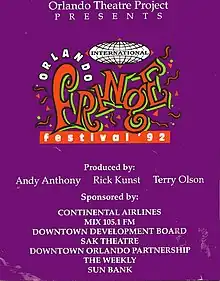 Founded in 1992, it was the second official fringe theatre festival in the United States and is now America's oldest still-operating fringe theatre festival,[1] celebrating its 30th anniversary in 2021. The festival has been voted the Best Local Festival of Orlando[2] and has been dubbed “Orlando’s Most Unique Cultural Experience.”[3]