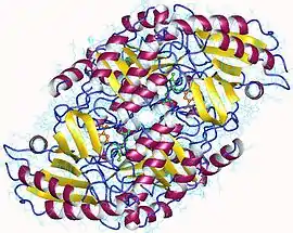 The structure of the OAT protein has been resolved using X-ray crystallography and shows similarity to other subgroup 2 aminotransferases such as dialkyglucine decarboxylatse.[3] The OAT protein functions as a dimer and each monomer consists of a large domain, which contributes most to subunit interface, and a C-terminal small domain, and an N-terminal region containing a helix, loop, and three-stranded beta-meander. In the central large domain is a seven-stranded beta-sheet covered by eight helices. The co-factor of the OAT protein (pyridoxal-5'-phosphate) binds to OAT through a Schiff base at the lysine 292 position situated between two of the seven-stranded beta-sheet. Three amino acids (R 180, E 235, and R413) are thought to be involved in substrate binding at the active site.[3]