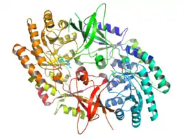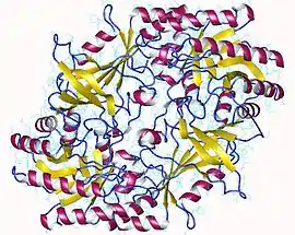 - PDB: 1d7k; Almrud JJ, Oliveira MA, Kern AD, Grishin NV, Phillips MA, Hackert ML (January 2000). "Crystal structure of human ornithine decarboxylase at 2.1 A resolution: structural insights to antizyme binding". J. Mol. Biol. 295 (1): 7–16. doi:10.1006/jmbi.1999.3331. PMID 10623504.; rendered via PyMOL.