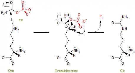Ornithine transcarbamylase (OTC) (also called ornithine carbamoyltransferase) is an enzyme (EC 2.1.3.3) that catalyzes the reaction between carbamoyl phosphate (CP) and ornithine (Orn) to form citrulline (Cit) and phosphate (Pi). There are two classes of OTC: anabolic and catabolic. This article focuses on anabolic OTC. Anabolic OTC facilitates the sixth step in the biosynthesis of the amino acid arginine in prokaryotes.[5] In contrast, mammalian OTC plays an essential role in the urea cycle, the purpose of which is to capture toxic ammonia and transform it into urea, a less toxic nitrogen source, for excretion.