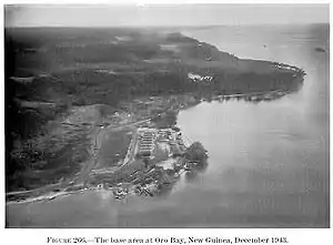 During World War II, Oro Bay was used as staging area, the terminus for convoys of Operation Lilliput, for the battle of Buna-Gona and future operations. A United States advanced base was constructed at Oro Bay, with a liberty ship wharf at the southern end of the bay, installations along the shore, and anti-aircraft gun batteries in the surrounding hills.[2] On 28 March 1943, Imperial Japanese planes attacked shipping and harbour facilities at Oro Bay, resulting in the sinking of SS Masaya and SS Bantam. Oro Bay Airfield was also located near here.