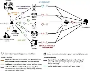 The sanitation and hygiene barriers when placed correctly prevent the transmission of an infection through hands, water and food. The F-diagram can be used to show how proper sanitation (in particular toilets, hygiene, handwashing) can act as an effective barrier to stop transmission of diseases via fecal–oral pathways.