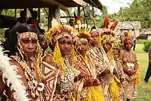 The rite of passage through which a child becomes an adult in Orokaiva society is largely exceptional among the peoples of Papua New Guinea, involving both girls and boys. It begins with masked figures, dressed in bird feathers and pigs' tusks and representing ancestral spirits, entering the village as if on a hunt, and herding up the children who are to go through initiation. The figures shout out "Bite, bite, bite," and physically assault pigs, trees and children, before taking the children away by force to a platform that is very much like that used for killing pigs, in a symbolic killing of the children. They then take the children into the forest, where the children are left, blindfolded, in an isolated hut, in silence - and they are then told that they have now become the spirits of the dead. In the hut they are told the symbolism of the different feathers and the nature of sacred dances. Following this, they return to their village, this time acting as hunters, just as their captors had originally done.[1]