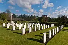In the corner of All Saints' Church sits Canadian Corner. This is a First World War memorial that marks where 182 soldiers who died being treated at Orpington Hospital are buried. The name derives from the fact 88 of those buried are Canadians. Canadian Corner is unique in that its design resembles that of First World War Cemeteries found in France & Belgium, with the text on the memorial suggesting that the Memorial Cross was the first outside of the Western Front, as the English public were interested in how the war cemeteries looked. The Memorial Cross in Canadian Corner was unveiled in 1921 in the presence of the High Commissioner for Canada.[48] The automatic plunger used to release the Union flag which hid the Cross was the same used by George V during the unveiling of The Cenotaph a year earlier. The Memorial Cross in Canadian Corner was the first Canadian Memorial unveiled in the UK.[48]