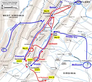 On July 23, 1861 he was put in command of the 5th Connecticut Volunteer Infantry, and given the rank of colonel.[7] The original regiment was the 1st Regiment Colts Revolving Rifles of Connecticut and was supposed to be led by Samuel Colt, but the unit never took the field.[8] Its organization failing, the regiment was reorganized in May 1861.[8] In early March 1862, Ferry led his troops across the Potomac River, and attacked the Confederates at Winchester, Virginia.[3] This action would later lead to what became the First Battle of Winchester. Ferry was well praised for his ability as a leader and as a military strategist. Ferry was promoted to brigadier general on March 17, 1862.[7] He was then put under the command of General James Shields, whose division joined that of Gen. Irvin McDowell. It was under McDowell that Ferry fought at the First Battle of Winchester.[3] Ferry continued to serve under Shields, during the Valley Campaign.[9]