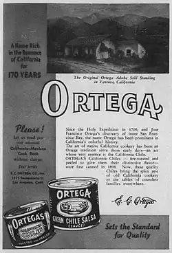 In the late 1890s, the family began roasting in the adobe's kitchen and built a wood shed adjacent to the adobe where the family's products were canned.[12] The Ortegas' 11th child, Emilio, established the Ortega Chile Packing Company at the site.[13][14] By 1899, Emilio's company had opened a factory three miles from Ventura where it employed 16 women and four men and processed 22 tons of chiles into 55,000 cans of roasted green chiles and green chile salsa bearing the image of the old adobe.[15] Even in the 1930s, the company's advertising continued to appeal to the romance of old California, featuring an image of "The Original Ortega Adobe Still Standing in Ventura, California".[16][17]