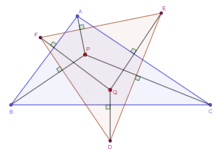 In geometry, two triangles are said to be orthologic if the perpendiculars from the vertices of one of them to the corresponding sides of the other are concurrent (i.e., they intersect at a single point). This is a symmetric property; that is, if the perpendiculars from the vertices A, B, C of triangle △ABC to the sides EF, FD, DE of triangle △DEF are concurrent then the perpendiculars from the vertices D, E, F of △DEF to the sides BC, CA, AB of △ABC are also concurrent. The points of concurrence are known as the orthology centres of the two triangles.[1][2]