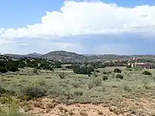 The younger intrusions in the belt are increasingly alkaline in composition,[1] and include the 25-26 Ma Cieneguilla basanite. This is a small-volume extrusive unit exposed around the village of La Cienega that may represent the earliest stages of opening of the Rio Grande rift. The basanite is characterized by larger olivine crystals (phenocrysts) in a very fine-grained matrix of clinopyroxene, magnetite, and nepheline, with a total silica content of 42.40-44.10 wt % and a high magnesium oxide content (11.50-13.50 wt %). This places the basanite among the most primitive magmas of the central Rio Grande rift, meaning that the magma was practically unaltered during its ascent to the surface from its origin in the upper mantle of the Earth. Isotope data suggests that the basanite came from mixed mantle source regions.[2]