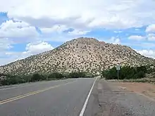 The main belt extends from the Cerrillos Hills in the north through the Ortiz Mountains to the San Pedro Mountains (35.2463111°N 106.1880296°W) and South Mountain (35.1840457°N 106.2213335°W). Cerro Pelon (35.3266488°N 105.9912396°W) is also geologically a part of the belt. Each of the clusters of mountains is a laccolith where magma intruded between sedimentary rock beds and cooled to form a dome-shaped body of rock. Magma preferentially intruded along bedding planes in the country rock, particularly in beds of weaker rock such as shales of the Chinle Formation or Mancos Shale. In some places, the magma broke through to the surface as lava to form volcanoes. The overlying volcanic rock and sedimentary beds subsequently were eroded away to leave the more resistant laccoliths.[1]
