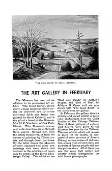 The February 1941 issue of The Living Museum, the official magazine of the Illinois State Museum, devotes a full page to The Good Earth, a Caldwell by painting added to the museum's permanent collection, which is described as "a large landscape which carries the observer's eye far across cultivated fields and farms."[5] The Good Earth was exhibited at the 1939 Annual Exhibition of Artists of Chicago and Vicinity at the Art Institute of Chicago.[6]
