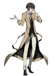 A member of the Armed Detective Agency who takes Atsushi under his wing, Dazai is known for being a "suicide maniac" because of his wish to commit suicide and die comfortably one day, preferably with a beautiful woman. Under his carefree and relaxed demeanor, however, Dazai is extremely cunning, intelligent, skilled and brutal, once being a feared executive for the Port Mafia. His ability, No Longer Human (人間失格, Ningen Shikkaku), lets him completely nullify any supernatural ability by touch.[9] Dazai takes a liking to Atsushi as his underling starts working for the Agency, believing him to be superior to some of the mafia's men. When allowing himself to be kidnapped by the Port Mafia, Dazai tells his former underling Ryūnosuke Akutagawa that Atsushi is superior to him, angering Akutagawa.[10] However, the relationship turns into an alliance between the Agency and the mafia to face a group known as the Guild. During the fight, Dazai joins forces with his former mafia ally, Chuuya Nakahara, to face members of the Guild.[11]
