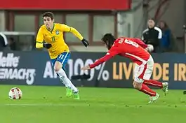 Oscar was given his first senior call-up as a substitute in a 0–0 draw against Argentina.[63] Due to injuries to the attacking midfielder Ganso, he saw his national team opportunities increase and was even preferred over more experienced playmakers on a number of occasions.[64] In June 2012, Oscar scored his first international goal in a friendly match in New York City against Argentina, which Brazil went on to lose 4–3. He also scored a penalty kick against China as well as recording three assists in the 8–0 rout, before firing a brace against Iraq one month later.[65]