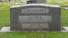 In 1906, Colquitt ran for governor, but, in part due to his opposition to Prohibition, he failed to win the Democratic nomination.[3][7] He ran again in 1910, still opposing Prohibition, with the slogan "Political Peace and Legislative Rest."[5] Although his opponents referred to him as "Little Oscar" for his diminutive stature, Colquitt won both the primary and the general election.[5] He was not present for the Democratic convention which nominated him for the position, as his youngest son, Oscar B. III age 4, died in Austin at roughly the same time.[5]