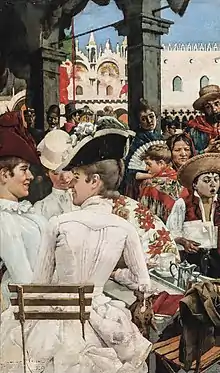 Wilson exhibited at other venues, including the Leeds Municipal Art Gallery in 1890, where he showed Mon Atelier, showing a sculptor's studio, lined with classical casts which are being studied by fashionably dressed lady. The Yorkshire Post considered that the painting was "admirable in tone, and full of sound workmanship, while if the figure introduced some respects rather jarring note, it gives a humorous turn to the spectator's thoughts by reason of the contrast it affords."[19][note 3] In 1897 Wilson exhibited at the Black and White gallery, where his work was described as "Brilliant, somewhat French in influence, and entirely modern in feeling" His pieceOutside the Empire was described as a "clever and characteristic example of this artist's skill in depicting the modern woman as he sees her."[21]