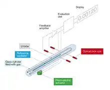 In modern digital density meters, Piezo elements are used to excite the U-tube whereby optical pickups determine the period of oscillation. This period τ can be measured with high resolution and stands in simple relation to the density ρ of the sample in the oscillator: