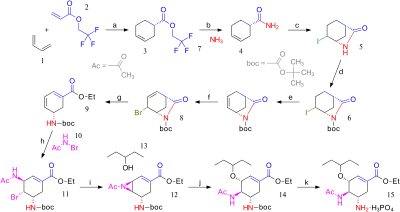 In 2006 the group of E.J. Corey published a novel route bypassing shikimic acid starting from butadiene and acrylic acid.[9] The inventors chose not to patent this procedure which is described below.