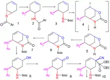Oseltamivir total synthesis concerns the total synthesis of the antiinfluenza drug oseltamivir[1] marketed by Hoffmann-La Roche under the trade name Tamiflu. Its commercial production starts from the biomolecule shikimic acid harvested from Chinese star anise and from recombinant E. coli.[2][3] Control of stereochemistry is important: the molecule has three stereocenters and the sought-after isomer is only 1 of 8 stereoisomers.