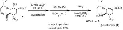 In 2009, Hayashi et al. successfully produced an efficient, low cost synthetic route to prepare (-)-oseltamivir (1). Their goal was to design a procedure that would be suitable for large-scale production. Keeping cost, yield, and number of synthetic steps in mind, an enantioselective total synthesis of (1) was accomplished through three one-pot operations.[14][5] Hayashi et al.'s use of one-pot operations allowed them to perform several reactions steps in a single pot, which ultimately minimized the number of purification steps needed, waste, and saved time.