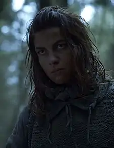 Osha travels with the Stark boys, their direwolves, and Hodor as they head for the Wall. They are crossed by the Reed siblings, Jojen and Meera, who try to reason with Bran. Jojen reveals who they are, and that Bran has a mission to reach the Three-Eyed Raven Beyond the Wall. Over time, Osha grows wary of Jojen and his ideas, and tries to confront him about putting ideas into Bran's head. Jojen reveals that they have no plan of going to the Wall, but instead inisit on traveling Beyond the Wall to seek the Three-Eyed Raven. Outraged, Osha warns them of the dangers and threats that lie ahead, which provokes her to tell them about her husband, Bruni, revealing that he had went missing and came back days later as a White Walker and almost killed Osha.[21] She burnt down her hut with Bruni inside and fled south of the Wall before the dangers became prominent.[22] With her motivations clear, Osha tells Bran she will not go further than the Wall and will not break her promise to Luwin.[23] During a storm, the group take refuge inside an abandoned windmill, while a group of wildlings outside fight. Jojen reveals to Bran that he is a warg after accidentally warging Hodor, which leads him to warging himself into Summer and unknowingly saves Jon Snow and Ygritte. Osha is still frustrated over the entire situation, but Bran suggests that she take Rickon to Last Hearth to seek refuge with House Umber, loyal allies to House Stark. Agreeing, Osha and Rickon say their goodbyes, and part ways.[24]