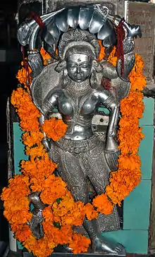 A niche in Mahavira Temple contains a sculpture of intertwined snakes which also is worshipped by Oswal Jain, as adhisthatyaka - devetas. This leads us to believe that a sizeable part of the populace in that period may have belonged to naga extraction. Nagabhata II was a Pratihara ruler of Mandore near Jodhpur. It is said that the Nagabhata II must have defeated the nagas and so he must have been given the name Nagabhatta which means 'master of nagas'. 'Nagabhatta' the son of 'Narbhatta' of Mandore line established his capital at Merta near Nagaur, whose old name was Nagapura. The Pratiharas may have conquered these areas from the nagas. Nagapriyagachha of Jain also indicates the same direction.