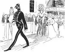 In 1906, Oskar, who apparently suffered from long depressions and obsessive-compulsive disorder, committed suicide by shooting himself. The reasons for this are not entirely known, but Andersson was also known for his social anxiety, as well as incidents during his work as a reportage cartoonist, as he was exposed to severe mistreatment of military horses, which as an animal lover worsened his depression.[2] Andersson is buried at Ekerö church cemetery.