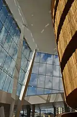 The Oslo Opera House (Norwegian: Operahuset) is the home of the Norwegian National Opera and Ballet, and the national opera theatre in Norway. The building is situated in the Bjørvika neighbourhood of central Oslo, at the head of the Oslofjord. It is operated by Statsbygg, the government agency which manages property for the Norwegian government. The structure contains 1,100 rooms in a total area of 49,000 m2 (530,000 sq ft).[2] The main auditorium seats 1,364 and two other performance spaces can seat 200 and 400. The main stage is 16 m (52 ft) wide and 40 m (130 ft) deep.[3] The angled exterior surfaces of the building are covered with marble from Carrara, Italy and white granite and make it appear to rise from the water. It is the largest cultural building constructed in Norway since Nidarosdomen was completed circa 1300.[4]