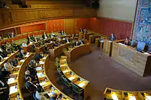 The room in which the City Council meets (Bystyresalen) is semi-circular. It is clad in oak and tapestries, the most noticeable of which was designed by Else Poulsson, the niece of the architect. Woven by Else Halling, it depicts St. Hallvard and the seven virtues. The artist hoped the design would remind the city's politicians of ethics and good decisionmaking.