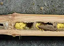 The nest of O. bicornis consists of an array of partitioned cylindrical cells[15] in holes in wood or reed tubes.[16] These bees accept a diverse range of pre-existing cavities as nest sites.[17] The cells are arranged linearly within a narrow tube. If the internal diameter of the tube exceeds 12 mm, then this linear arrangement may be forced into two rows instead of one. The length of each cell can vary from 10 to 21 mm.[18] The inner sides of the partitions are rough and convex, while the outer sides are smooth and concave. Between the cells and the terminal plug is a space known as the vestibular cell.[15] The vestibule acts as a form of protection against volatile environmental conditions. The bees whose nests are exposed to the sun and heat build vestibules more frequently.[16] The material used to build the nests is mud mixed with their mandibles,[18] but the sides of the tunnel in which the nests are located are usually not lined with mud, with the exception of some irregularly arranged nests.[15] Females construct around six cells per nest on average; however, larger females construct more cells than smaller ones.[19] When it is time for females to lay their eggs, they add pollen to each brood cell and lay one egg in each cell next to the pollen.[20] The sequence of nesting behavior is: cell construction, provisioning, egg-laying, and sealing the cell.[15]