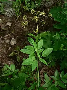 The inflorescence is a compound umbel of many tiny yellowish flowers at the tip of a stemlike peduncle. The fruit is elongated and narrow, up to 2.2 centimeters long.[4][5]