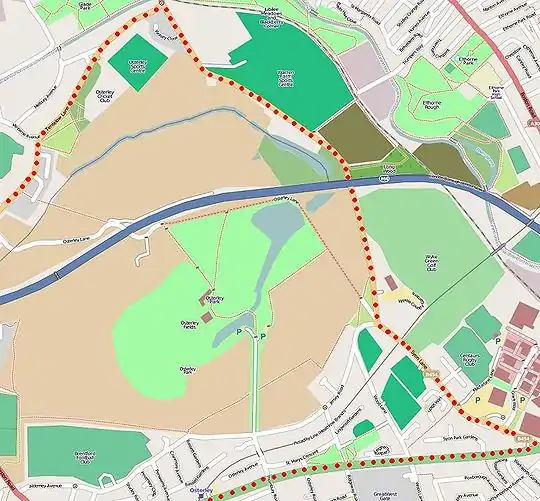 Osterley is on the most elevated soil of the parish,[2] dissected by A4 (The Great West Road) and extends further north than the M4 Motorway. Syon Lane forms the border to the east, while the border with the town of Heston is to the west. Osterley extends to the south of the A4 to at least Church Road based on house deeds, much housing existed before mid 1930s and before the A4, St Mary's Church south of the A4 is also in Osterley.