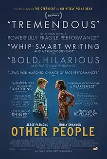 Other People is a 2016 American comedy-drama film written and directed by Chris Kelly in his feature directorial debut. The film stars Jesse Plemons, Molly Shannon, Bradley Whitford, Maude Apatow, Madisen Beaty, John Early, Zach Woods, Josie Totah,[lower-alpha 1] and June Squibb. It is a semi-autobiographical look at Kelly's family.