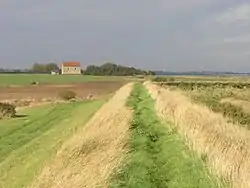 Othona's location at the edge of the Dengie Peninsula was ideal for control of the estuaries of the rivers Blackwater and Colne, the latter leading to the important city of Camulodunum (now Colchester).[4] The fort's shape was roughly trapezoidal, with rounded corners. The stone rampart was 4.2 metres thick, indicating a tall superstructure, and enclosed over 2 hectares (4.9 acres). A single exterior ditch surrounded the site. Although some of the Roman building material was reused in the 7th century Chapel of St Peter-on-the-Wall, enough of the rampart survived until the 17th century, when it was described by the local historian Philemon Holland as a "huge ruin".[5] It has since been largely swallowed by the sea, leaving scant remains on view.