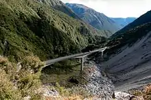The Otira viaduct is to the south of Otira, between Otira and the Arthur's Pass summit. Completed in 1999 by McConnell Smith Pty Ltd, the 440 metres (1,440 ft) four-span viaduct carries State Highway 73 over a stretch of unstable land, replacing a narrow, winding, dangerous section of road that was prone to avalanches, slips and closures.[16] One person, Tony Western, 25, was killed during construction in July 1998 when a chain failed and a pump fell on him. [17] A plaque was installed in his memory in the base of the westernmost pier.