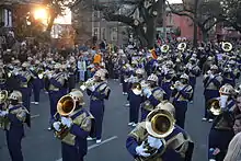 The famed "Marching 100" was the first African-American high school band to march in the Rex parade on Mardi Gras Day, in 1967. The "Marching 100" also played for Pope John Paul II in 1987 and for eight U.S. Presidents.[6] Additionally, the band has performed for five Super Bowls, the Macy's Thanksgiving Day Parade in New York City, and the 2002 Tournament of Roses Parade in Pasadena, California.[7] The band was the subject of a 60 Minutes segment New Orleans' St. Augustine High School Marching Band, the self-proclaimed "Best Band in the Land" which first aired March 14, 2021,[8] which (on the east coast) immediately preceded the live broadcast of the Grammy Awards, in which four St. Augustine alumni had been nominated.[9]