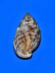 The coloring of this shell is whitish. The shell is ornamented with reddish spots arranged in transverse series, almost always united, and forming three bands upon the upper whorls, and five upon the body whorl. Upon this is often seen also, a large brown and irregular blotch. The aperture ovate, elongated, narrow, and slightly oblique. The outer lip is thick, white, forming a little gutter at the base. The columella is imperforate at its lower extremity, oblique, bearing three unequal folds. The first is more prominent, is horizontal, thin, and sharp; the two others are oblique and smaller.[3][4][5]