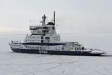 During extensive ice trials in the Bothnian Bay in March 1986, Otso was put through a series of test to determine her icebreaking capability. In a race against the 1975-built Urho in 0.8-metre (31 in) level ice, Otso beat the older but more powerful four-propelled icebreaker by more than a ship's length,[8][9] showing that in terms of ice resistance the new icebreaker was superior to her predecessor.[5] In 40-centimetre (16 in) ice, she could easily maintain a speed of 16 knots (30 km/h; 18 mph) and small ice ridges along the way appeared to be of no consequence to the vessel. However, the strength of the new icebreaker was put to the ultimate test when she encountered a large pressure ridge reaching all the way to the seafloor some 20 metres (66 ft) below the surface. After preparations, Otso was accelerated to a speed of 14 knots (26 km/h; 16 mph) and rammed into the ridge at full power. Since the new icebreaker had a smooth inclined stem and lacked the bow propellers of her predecessors, she rode up the ridge and began listing to the port side as the hull rose from the water. After coming to a stop, Otso slid back by herself without utilizing the engines, and the ridge was penetrated on the second charge.[3][9] The robustness of the ship and its propulsion system were further proven when the icebreaker was backed into a ridge at 10 knots (19 km/h; 12 mph) "to prove to the customer it doesn't break".[11]